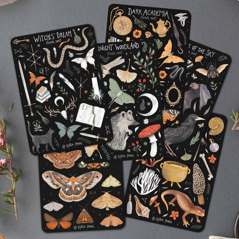All the sticker sheets have over 20 or 30 stickers each of various sizes. They feature a collection of animals including a hedgehog, birds, moths, as well as mushrooms, plants, celestial symbols, feathers, swords, runes, candles, skulls, books and much more. Black stickers are ideal for darker themes or black backgrounds, while white ones are perfect for notebook and journals or just to make them pop!