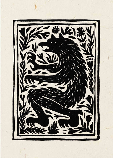 This is a fine art greeting card featuring the lino print 'Wolf', 2024. It's a werewolf surrounded by a woodland, and is reminiscent of medieval banners and heraldry.